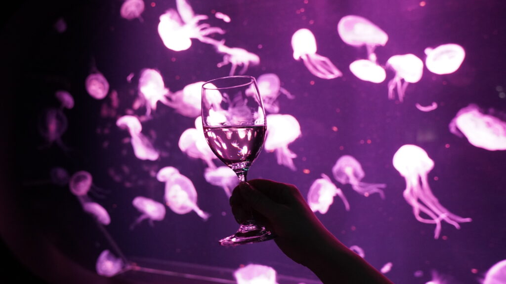 展示内容:17時以降、通常青色のクラゲの水槽が、桜色に変わり、桜の花びらが舞っているかのようにクラゲが水の中を漂う空間に様変わりします。