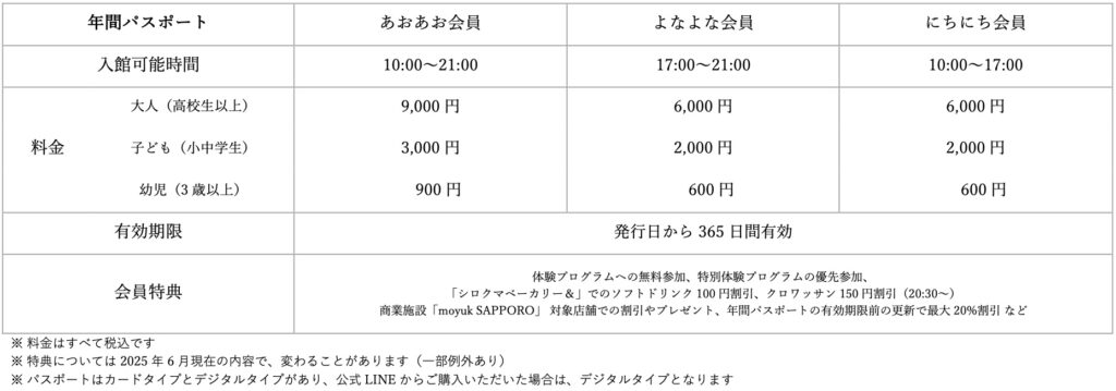 「すいぞくかんクラブ」は、水族館を日常的に楽しんでいただくための会員制度です。生物に関する体験プログラムや、イベントなどの優先参加、「シロクマベーカリー&」の一部メニューの特典のほか、商業施設「moyuk SAPPORO」対象店舗での割引やプレゼントなどが受け取れます。会員になるとAOAO SAPPOROの年間パスポートが発行されるほか、有効期限前に更新手続きをすると、最大20%割引のお得な料金で継続できます。