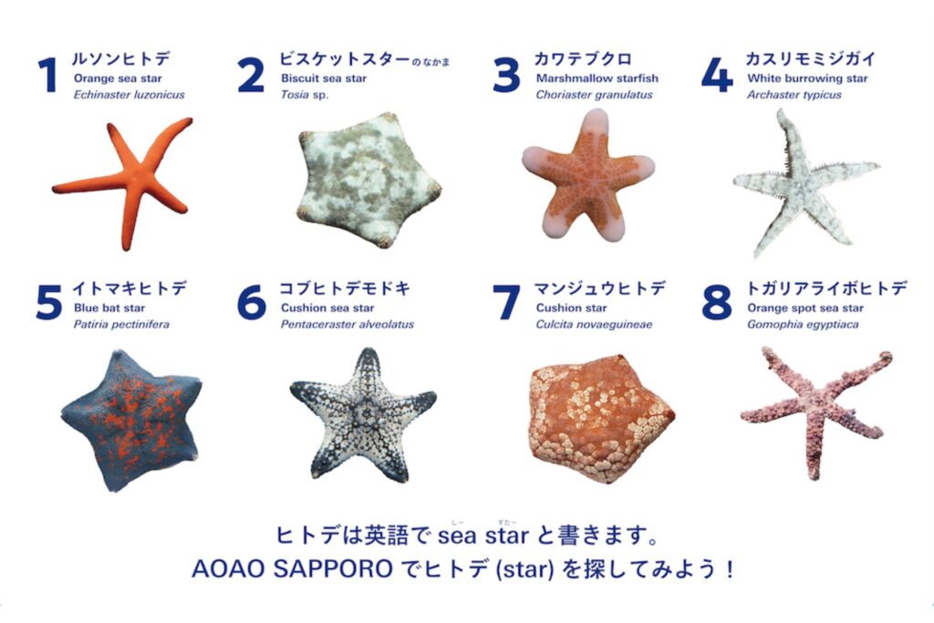 内容:企画展で展示している、色や形など多様な姿の 10 種類のヒトデのなかから、札幌市徽章にふさわしいヒトデを「札幌のスター」として選んで投票します。投票結果は、AOAO SAPPOROのSNSを通じて、ヒトデの不思議とともに定期的に発信していきます。