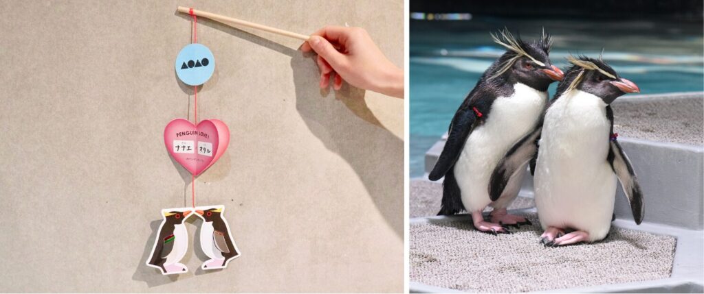 今回のクラフトアクアリウムでは、ペンギンのカップルをモチーフに、誰でも気軽に参加できるモビールづくりのプログラムを開催します。完成したあとは、6F「PENGUINS」で「キタイワトビペンギン」の求愛行動を観察してみましょう。