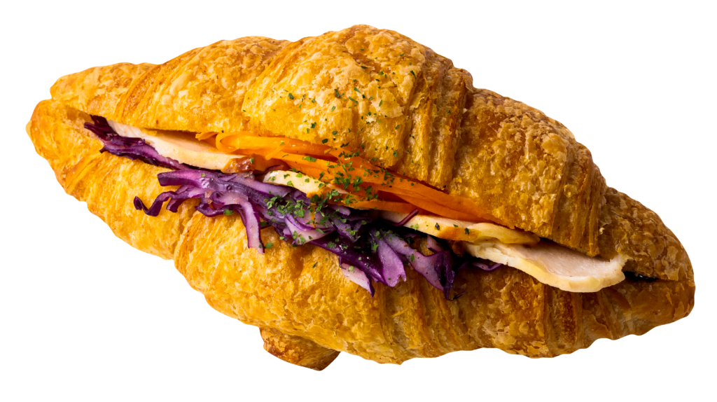 天然酵母クロワッサンに紫キャベツラペ、ローストチキン、キャロットラペをサンドして、レモン風味に仕上げました。
