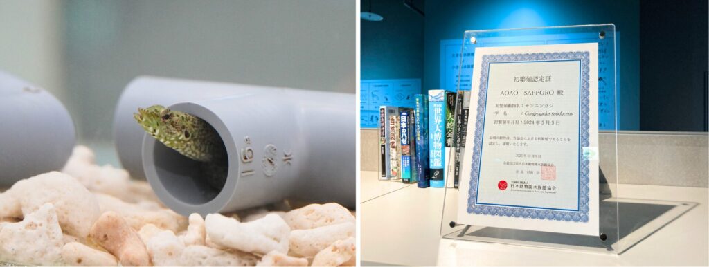 2024年5月にAOAO SAPPOROで繁殖に成功した「センニンガジ」が、公益社団法人 日本動物園水族館協会(以下、JAZA)によって、「初繁殖認定」を受けました。初繁殖認定とは、動物園・水族館が飼育している動物が国内で初めて繁殖したことを、JAZAが証明するものです。AOAO SAPPOROでは開業以来、初めてになります。