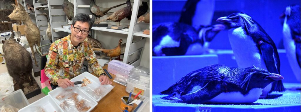 【(左)川上和人先生、(右)夜のキタイワトビペンギンの様子】